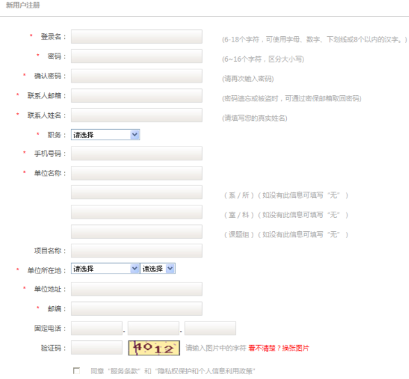 2.進入注冊頁面,根據(jù)要求認真填寫注冊信息,帶紅色標記的為必填項,并同意注冊條款,就可生成新用戶。