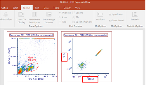 圈中目的細(xì)胞群,拖至空白處形成一個(gè)新的圖形,并根據(jù)需要改動(dòng)橫縱坐標(biāo)軸的參數(shù)。本示例中以FITC和PE為例,調(diào)節(jié)此兩通道之間的補(bǔ)償。下圖所示,補(bǔ)償未經(jīng)過(guò)調(diào)節(jié),F(xiàn)ITC與PE之間有補(bǔ)償。