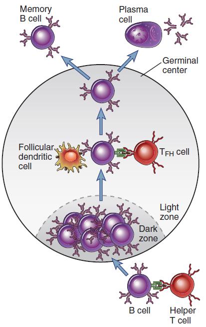 Tfh 細(xì)胞的主要作用是增加高親和力 B 細(xì)胞和長壽漿細(xì)胞的形成,并幫助他們轉(zhuǎn)移到發(fā)生中心(GC)。在接受抗原刺激后,初始 B 細(xì)胞首次移動(dòng)到 T 細(xì)胞區(qū),且在來自 Tfh 細(xì)胞和抗原呈遞細(xì)胞的共刺激作用下開始活化并形成發(fā)生中心。當(dāng)發(fā)生中心的 B 細(xì)胞開始分化為漿細(xì)胞或記憶 B 細(xì)胞時(shí), Bcl-6 會(huì)阻止 B 細(xì)胞的增殖,因?yàn)?Bcl-6 可以抑制 B 細(xì)胞活化基因的表達(dá),如 CD69、 STAT1 和 CD80 等,同時(shí)也會(huì)通過調(diào)節(jié) Prdm1 來抑制發(fā)生中心的 B 細(xì)胞向漿細(xì)胞分化。 Tfh 細(xì)胞通過 CD40 的作用致使 Bcl-6 轉(zhuǎn)錄沉默,從而促使發(fā)生中心 B 細(xì)胞存活和增殖。且在這一過程中,CD40L、PD-1、BAFF、IL-4 和 IL-21 等信號(hào)分子的參與也是必不可缺的。