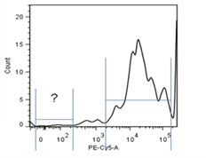 補償調(diào)節(jié)抗體的正確選擇對于熒光通道之間的補償調(diào)節(jié)是非常重要的。要求選擇的抗體所結合的抗原分子在樣本細胞中有明確表達,占樣品細胞的10%以上,50%以下。如果陽性細胞比例太低,在陽性細胞區(qū)域無法形成明顯的細胞團,無法判斷調(diào)節(jié)是否合適。如陽性細胞比例過高,則不表達該抗原的陰性細胞無法形成明顯的細胞團,如圖1-4直方圖所示。