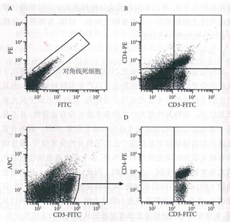 雖然死細(xì)胞位于散點(diǎn)圖的對(duì)角線上,但是對(duì)角線上的細(xì)胞確不一定是死細(xì)胞,因?yàn)殡p陽(yáng)性細(xì)胞如果在x軸和y軸的熒光信號(hào)相似時(shí),也可以位于對(duì)角線上。所以,散點(diǎn)圖對(duì)角線上的細(xì)胞可能是死細(xì)胞,也可能是雙陽(yáng)性細(xì)胞。如圖1-B所示,樣本細(xì)胞為正常小鼠脾臟細(xì)胞,標(biāo)記 FITC-抗CD3抗體和PE-抗CD4抗體,F(xiàn)ITC和PE雙陽(yáng)性的CD4 T細(xì)胞和死細(xì)胞混在一起,無(wú)法區(qū)分。但是死細(xì)胞和雙陽(yáng)性細(xì)胞的形狀是不一樣的,死細(xì)胞呈現(xiàn)連續(xù)的線型分布,而雙陽(yáng)性細(xì)胞群呈現(xiàn)圓形的群體分布,因此,可以從對(duì)角線上的細(xì)胞群體的形狀大致判斷細(xì)胞的性質(zhì)。雖然不能根據(jù)熒光強(qiáng)度的強(qiáng)弱來(lái)區(qū)分該熒光信號(hào)是來(lái)自于死細(xì)胞的非特異性熒光還是來(lái)自熒光素產(chǎn)生的熒光,但是可以利用在散點(diǎn)圖上死細(xì)胞位于對(duì)角線的特點(diǎn)來(lái)區(qū)分死細(xì)胞和陽(yáng)性活細(xì)胞。如圖1-C所示,x軸表示FITC通道(樣本細(xì)胞標(biāo)記有FITC-抗CD3抗體),y軸表示APC通道(閑置通道),借用該散點(diǎn)圖可以明確區(qū)分圖1-B中無(wú)法區(qū)分的死細(xì)胞和雙陽(yáng)性細(xì)胞。此時(shí)只需要將排除了死細(xì)胞后的CD3 T細(xì)胞設(shè)門,將門內(nèi)的細(xì)胞顯示于新的FITC-PE散點(diǎn)圖中,如圖1-D,此時(shí)該散點(diǎn)圖內(nèi)的細(xì)胞都是活細(xì)胞,因?yàn)闃颖炯?xì)胞同時(shí)標(biāo)記有PE-抗CD4抗體,所以圖中的細(xì)胞明顯分為兩群,雙陽(yáng)性的是CD4T細(xì)胞,單陽(yáng)性的是CD8 T細(xì)胞。