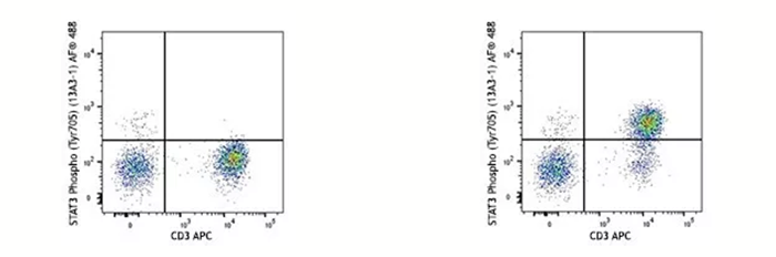 在蛋白翻譯后修飾(磷酸化、乙?;⒓谆龋┑难芯窟^程中,固定劑不僅可以有效的“固定”住翻譯后修飾的位點(絲氨酸、蘇氨酸、酪氨酸等),也可以防止目標位點在活細胞中很快降解(比如磷酸酶會去除磷酸化修飾、去甲基化酶會移除甲基化修飾等)。下面的例子是用IL-6的重組蛋白刺激人外周血15分鐘后看STAT3第705位酪氨酸的磷酸化水平,在刺激完樣本后就需要通過固定來實現(xiàn)目的氨基酸磷酸化水平“停留”在IL-6刺激15分鐘這個節(jié)點上。