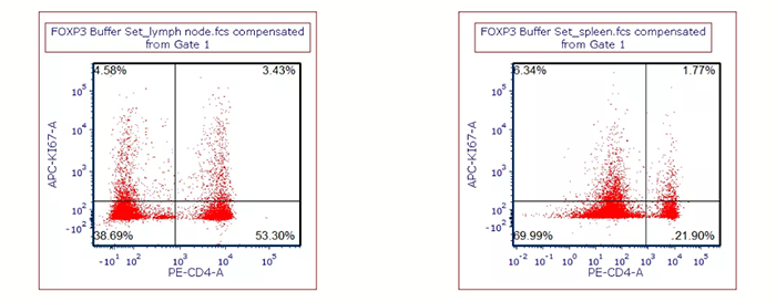 用BioLegend FOXP3 Buffer set對細胞進行固定破膜處理后,染Ki-67抗體,左圖:小鼠淋巴結(jié)樣本;右圖:小鼠脾臟樣本。
