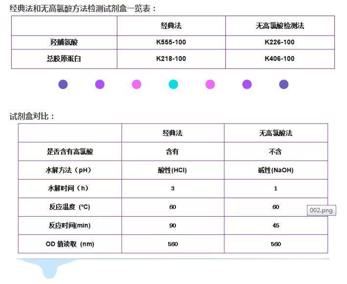 Figure (A). 經(jīng)典高氯酸法檢測的試劑盒(k555-100)和無高氯酸法檢測試劑盒(k266-100)的標準曲線之間的相關(guān)性比較。數(shù)據(jù)顯示此兩種檢測方法具有非常好的相關(guān)性(R2 > 0.999)。 (B). K266-100試劑盒檢測大鼠樣本中的總羥脯氨酸的含量。