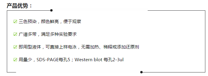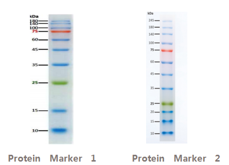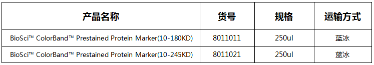 BioSciTM ColorBandTM Prestained Protein Marker 是一種三色預染的即用型蛋白分子量標準品,包括十種分子量從的預染重組蛋白,經SDS-PAGE凝膠電泳或轉膜后可觀察到清晰的彩色蛋白條帶,其中25KD為綠色條帶,75KD為紅色條帶,其余條均為藍色條帶。
