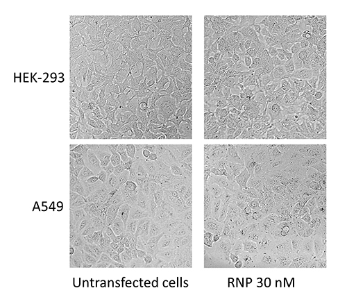 在96孔板中用30nm RNP(Cas9蛋白和HPRT1 sgRNA)和0.3 μl的jetCRISPR?轉(zhuǎn)染HEK-293和A549細胞,轉(zhuǎn)染48h后,使用phase contrast ZOE Fluorescent Cell Imager (BIORAD?)觀察細胞狀態(tài)。