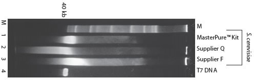 1%瓊脂糖膠電泳分析不同試劑盒提取純化啤酒酵母的500ng DNA,使用EB進(jìn)行染色。用MasterPure? Kit分離的DNA的大小絕大多數(shù)在40-50 kb范圍內(nèi)。用其它試劑盒提取的DNA會(huì)降解成更小的片段。