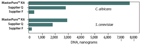 分別提取S.cerevisiae和C. albicans.中的DNA,用熒光染料33258對(duì)DNA進(jìn)行定量分析(RNA對(duì)該定量幾乎沒有影響)。圖中顯示的是兩次實(shí)驗(yàn)的平均DNA得率 。MasterPure Kit對(duì)C.albicans的提取量相比其它試劑盒高17倍;對(duì)S. cerevisiae的提取量相比其它試劑盒高12倍。