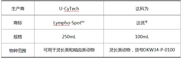 目前,我們同時(shí)提供U-CyTech原產(chǎn)的Lympho-Spot?無(wú)血清培養(yǎng)基和U-CyTech授權(quán)達(dá)科為在國(guó)內(nèi)生產(chǎn)的達(dá)優(yōu)?無(wú)血清培養(yǎng)基。它們的原料來(lái)源與質(zhì)控標(biāo)準(zhǔn)完全相同,能獲得同樣出色的檢測(cè)結(jié)果。由于物種的差異,部分添加成分在靈長(zhǎng)類和嚙齒類之間有差別。U-CyTech公司采取了同時(shí)添加的策略,所以生產(chǎn)出的是通用達(dá)優(yōu)?無(wú)血清培養(yǎng)基;達(dá)科為公司采取的是分別添加的策略,所以生產(chǎn)出的是專用達(dá)優(yōu)?無(wú)血清培養(yǎng)基,分靈長(zhǎng)類和嚙齒類兩個(gè)品種。詳細(xì)的差別見下表。