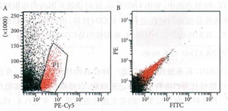 PE-Cy5通道(通常是FL3,接收的熒光波長(zhǎng)范圍大致為655-685nm)有時(shí)可用于識(shí)別死細(xì)胞,但首先該通道必須是閑置的通道,及樣本細(xì)胞中沒(méi)有標(biāo)記該通道代表的熒光素(PE-Cy5、PerCP等)偶聯(lián)抗體。選擇PE-Cy5-SSC散點(diǎn)圖,一般可看到不成群的PE-Cy5陽(yáng)性細(xì)胞,這些陽(yáng)性細(xì)胞的SSC值也是散在分布的,這些散在的PE-Cy5通道非標(biāo)記陽(yáng)性細(xì)胞,即圖2-A中的紅色部分,將這部分細(xì)胞設(shè)門顯示于FITC-PE散點(diǎn)圖中,如圖2-B所示,這部分PE-Cy5通道非標(biāo)記陽(yáng)性細(xì)胞基本都位于對(duì)角線部分,而對(duì)角線細(xì)胞一般為死細(xì)胞,所以散在的PE-Cy5通道非標(biāo)記陽(yáng)性細(xì)胞一般就是死細(xì)胞。