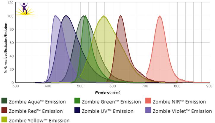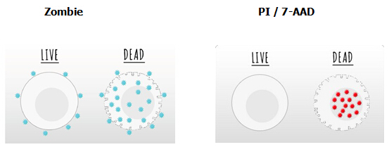 Zombie Dyes有別于PI和7-AAD等DNA染料,它是一種可用于需固定細(xì)胞實(shí)驗(yàn)的染料,通過(guò)與細(xì)胞上蛋白質(zhì)的氨基結(jié)合來(lái)實(shí)現(xiàn)。因活細(xì)胞可排除染料,所以僅細(xì)胞膜被著色;而死細(xì)胞的細(xì)胞膜及細(xì)胞質(zhì)均被著色,繼而根據(jù)熒光信號(hào)的強(qiáng)弱來(lái)區(qū)分死/活細(xì)胞。而且Zombie Dyes可選擇性多,可以由不同的激發(fā)光激發(fā),便于靈活選擇。