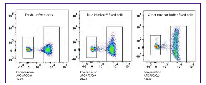 主要表現(xiàn)在固定劑對串聯(lián)染料(tandem-dye,如APC/Cy7、PE/Cy7等)的影響:一個是固定劑有可能造成串聯(lián)染料的斷裂,比如APC-Cy7和4%多聚甲醛溶液接觸時間超過4個小時染料就有可能斷裂,所以如果細胞直接重懸在固定液里面建議盡快上機,如果要放到第二天上機,需離心去除固定液后重懸在流式染色液或者是PBS里面,當然有一些新的串聯(lián)熒光素可以有效減少這種情況,比如BioLegend的APC/Fire750TM染料。