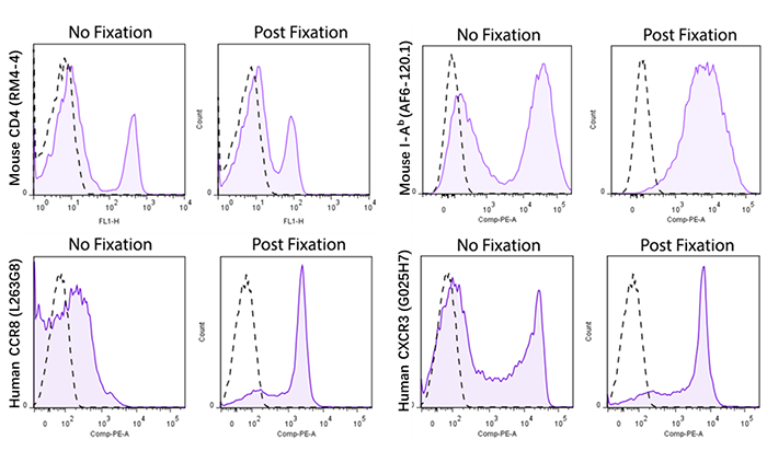 如果我們的流式實驗要求對樣本進行預先固定的處理,那實際上這就需要提前去驗證染色方案里所選的克隆是否適用于先固定后染色,這也有一定工作量。推薦大家參考借鑒BioLegend關(guān)于固定的專題,里面有做了很多克隆能否適用于先固定后染色的驗證。