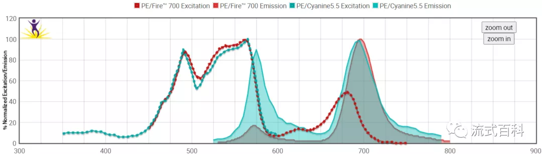 很顯然,在傳統(tǒng)的流式平臺PE/Fire? 700和PE/Cyanine5.5是不可以使用在同一個panel中的,但是在光譜流式中,兩種熒光染料由于其光譜特性存在一定的差異,是可以區(qū)分開: