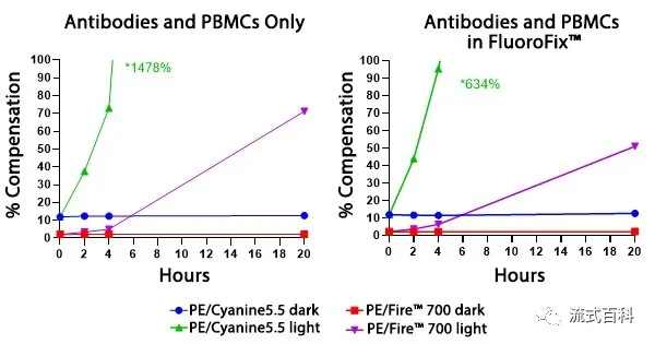 PE/Fire? 700 和PE/Cyanine5.5標(biāo)記的兩種CD4抗體檢測人裂紅外周血,抗體孵育完成后在固定洗滌馬上去檢測條件下和過夜后的條件下,在5激光Cytek? Aurora 光譜流式平臺檢測,PE/Fire? 700 在不同的實驗方案中對多聚甲醛的固定具有穩(wěn)定的抗性,表現(xiàn)出比PE/Cyanine5.5更優(yōu)秀的穩(wěn)定性,但是在磷酸化指標(biāo)的檢測方案中,PE/Fire? 700熒光素的穩(wěn)定性出現(xiàn)了一定程度的下降。