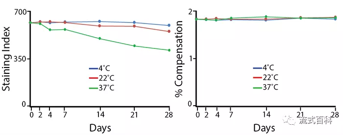 將PE/Fire? 700標(biāo)記的抗體分裝后分別保存在4℃、22℃和37℃下。穩(wěn)定性可以根據(jù)抗體的染色指數(shù)(staining index)和熒光補償百分比來衡量,隨著保存時間的延長,3種溫度保存條件下光補償百分?jǐn)?shù)并沒有發(fā)生改變,但是37℃的保存條件染色指數(shù)下降了約36%,22℃保存條件的染色指數(shù)下降了約12%,這主要是由于這兩種保存條件下抗體的非特異性染色背景升高引起的(檢測平臺為5激光Cytek? Aurora 光譜流式)。