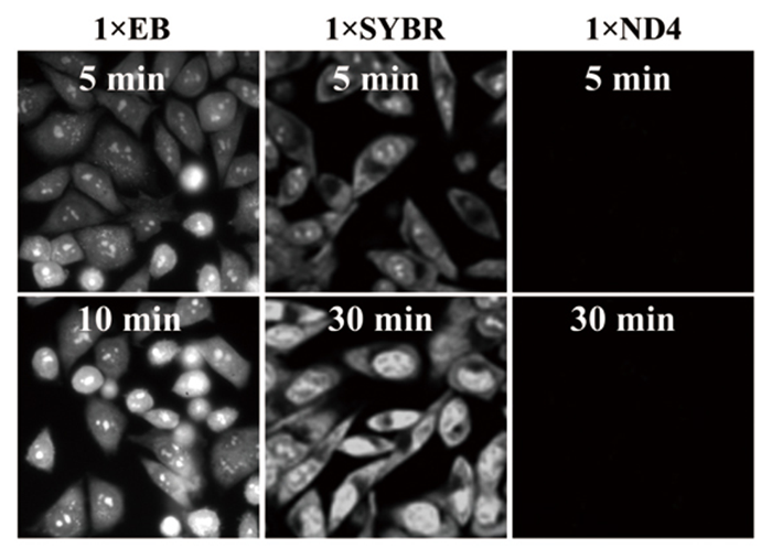 在37℃條件下,HeLa細(xì)胞在1×EB、1×SYBR和1×ND4,分別孵育5min、10 min或30 min。