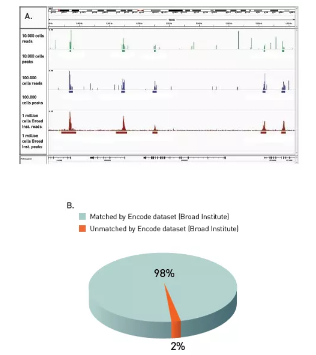 A、用Diagenode的H3K4me3抗體、True MicroChIP Kit進行ChIP實驗,10000個細胞中ChIP下來17pg DNA,對照組35pg DNA。IP下來的DNA用MicroPlex Library Preparation Kit擴增并被轉(zhuǎn)化為可用于Illumina?平臺測序的文庫,通過IlluminaR Genome Analyzer分析文庫,根據(jù)說明書進行簇生成和測序。