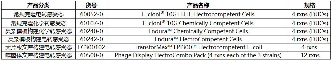 試用裝為Endura?電轉(zhuǎn)/化學轉(zhuǎn)感受態(tài)細胞,共4個反應;