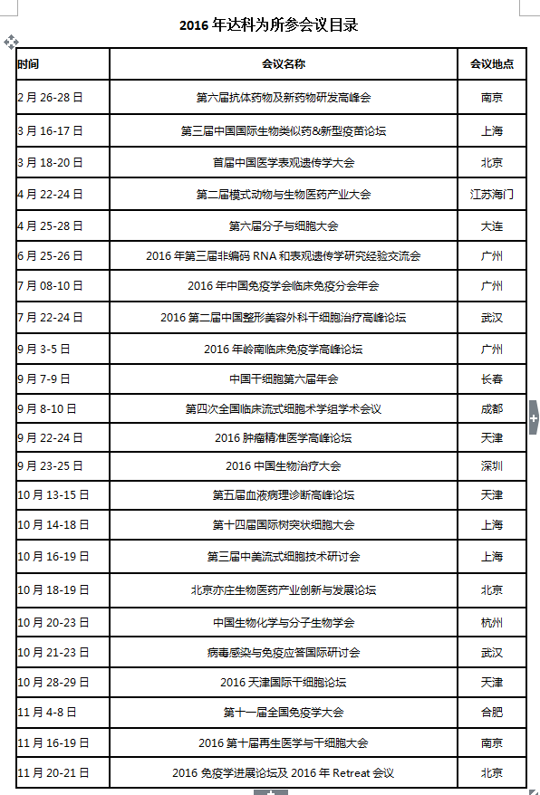 2016年達(dá)科為生物技術(shù)有限公司參展會議列表